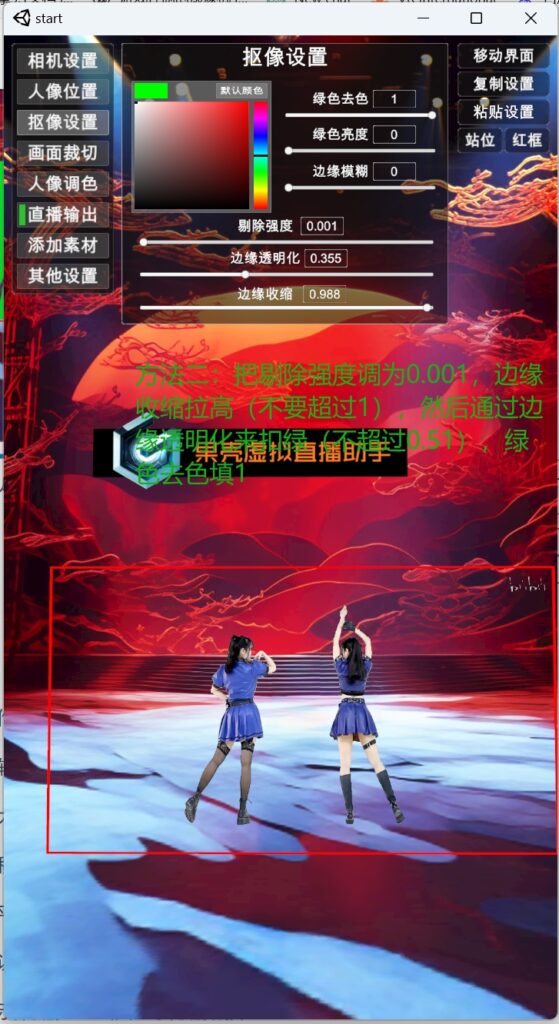 然後打開(kāi)“摳像設置”菜單:主要(yào)有(yǒu)兩種扣綠(lǜ)方式,參考下(xià)圖1、2的(de)參數(shù),如(rú)串接了(le)YY開(kāi)播,則可(kě)以<考慮用(yòng)YY扣綠(lǜ)的(de)方式,如(rú)圖3所示