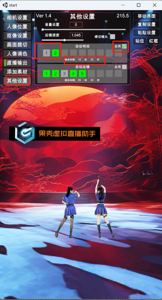 1) 如(rú)要(yào)設置自(zì)動運鏡/自(zì)動特效,勾選相(xiàng)應位置的(de)“啓用(yòng)”按鈕,綠(lǜ)色背景的(de)數(sh&ù)字 表示 把該特效/運鏡加入自(zì)動運行(xíng),灰色表示不(bù)參與自(zì)動運行(xíng),可(kě)以通(tōng)過鼠标點擊相(xiàng)應數(shù)字加入/退出。觸發時(shí)間(jiān)可(kě)以通(tōng)過鍵盤輸入,表示多(duō)長(cháng)時(shí)間(jiān)播放(fàng)下(xià)一(yī)組特效≥/運鏡