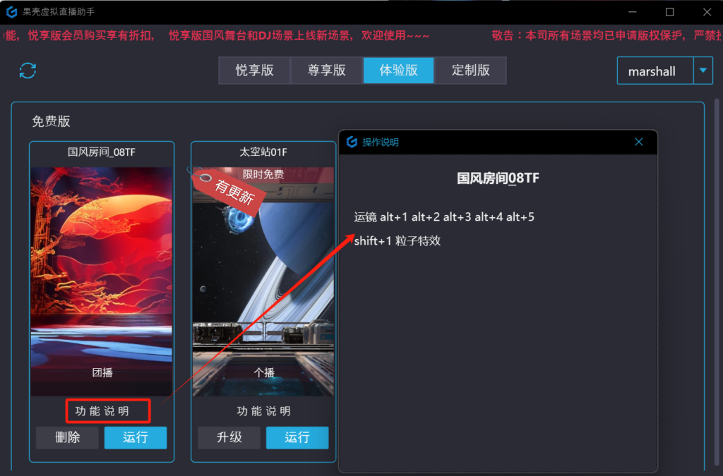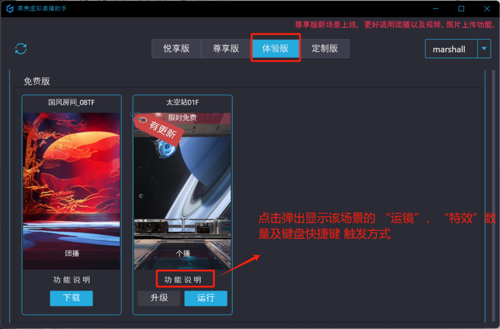 如(rú)下(xià)圖所示,新用(yòng)戶選 體(tǐ)驗版 進行(xíng)調試體(tǐ)驗,功能(néng)說(shuō)明(míng)列出了(le)該場(chǎng)景的($de) “運鏡”及“特效” 數(shù)量及相(xiàng)應的(de)鍵盤觸發快(kuài)捷鍵,點擊 “下(xià)載” 按鈕進行(xíng)場(chǎng)景"資源下(xià)載,下(xià)載完後,點擊“運行(xíng)”按鈕運行(xíng)。