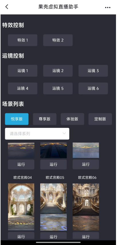 可(kě)以通(tōng)過雙擊場(chǎng)景圖片 打開(kāi)新場(chǎng)景,其次支持 特效 及 運鏡 播放(fàng)。注>意:手機(jī)操作(zuò)同時(shí)隻支持單個(gè)手機(jī)操作(zuò),要(yào)換手機(jī),得(de)先退ε出之前已經進入的(de)手機(jī)的(de)操控頁面。