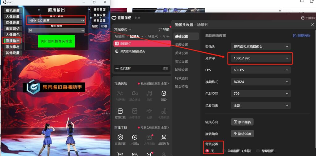 打開(kāi)場(chǎng)景的(de)菜單,點擊“直播輸出”,打開(kāi)虛拟攝像機(jī)(分(fēn)辨率默認設置就(jiù)好(hǎo)),然後打開(kāi)直播伴侶,添加新的(de)攝像頭,選擇“果殼虛拟直播攝像頭”,分(fēn)辨率設置 與 果殼直播輸∞出的(de)分(fēn)辨率必須保持一(yī)緻(1080*1920)。其它平台的(de)直播與之類似,都(dōu)是(shì)添加果殼虛拟攝像頭,分(fēn)辨率設置為(wèi)1080£215;1920。
