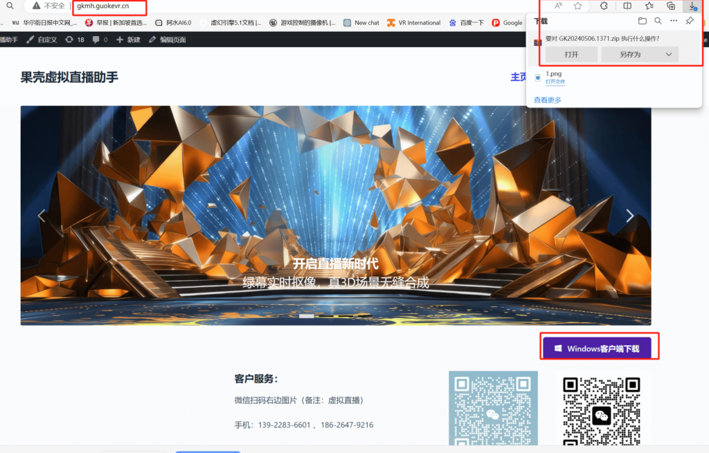 1)打開(kāi)浏覽器(qì),輸入http://gkmh.guokevr.cn,點擊Windows客戶端下(xià)載,下(xià)載完後,進行(xíng)解壓,安裝。