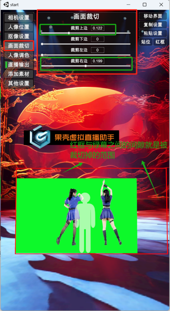4)畫(huà)面裁切:對(duì)于相(xiàng)機(jī)拍(pāi)攝的(de)範圍,上(shàng)下(xià)左右四個(gè)邊有(yǒu)拍( pāi)出綠(lǜ)幕範圍的(de),或者不(bù)想要(yào)顯示的(de),可(kě)以通(tōng)過 畫(huà)面裁切 進行(xíng)裁切:
