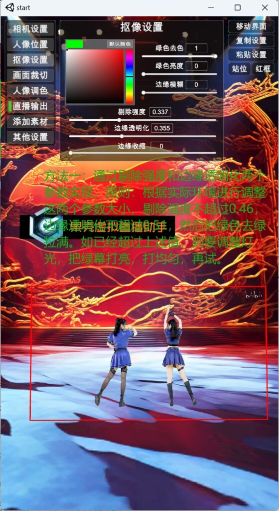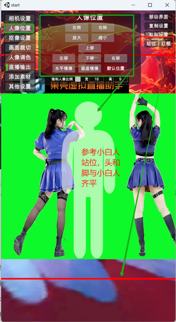 3)人(rén)像位置:點擊左邊菜單第二項 人(rén)像位置,可(kě)以調節 相(xiàng)機(jī)傳入畫(huà)面的(de) 大(dà)小(xiǎo),位移及¥旋轉,菜單最後邊的(de)兩個(gè)按鈕“站(zhàn)位”及“紅(hóng)框”,點擊“站(zhàn)位”,彈出參考站(zhàn)位的(de)小(xiǎo)白(bái)人(rén★),人(rén)的(de)站(zhàn)位建議(yì)按照(zhào) 小(xiǎo)白(bái)人&(rén)的(de)大(dà)小(xiǎo)站(zhàn)位(頭不(bù)要(yào)超過小(xiǎo)白(bái)人(rén)太多(duō),否則切換近(jìn)景運鏡人(rén)容易出框≤),調好(hǎo)站(zhàn)位後,再點擊“站(zhàn)位”,隐藏小(xiǎo)白(bái)人(rén)。 點“紅(hóng)框”按鈕,顯示的(∞de)是(shì)相(xiàng)機(jī)所拍(pāi)攝畫(huà)面的(de)大(dà)小(xiǎo)範圍。