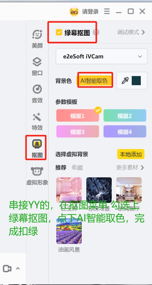 然後打開(kāi)“摳像設置”菜單:主要(yào)有(yǒu)兩種扣綠(lǜ)方式,參考下(xià)圖1、2的(de)參數(shù),如(rú)串接了(le)YY開(kāi)播,則可(kě)以<考慮用(yòng)YY扣綠(lǜ)的(de)方式,如(rú)圖3所示