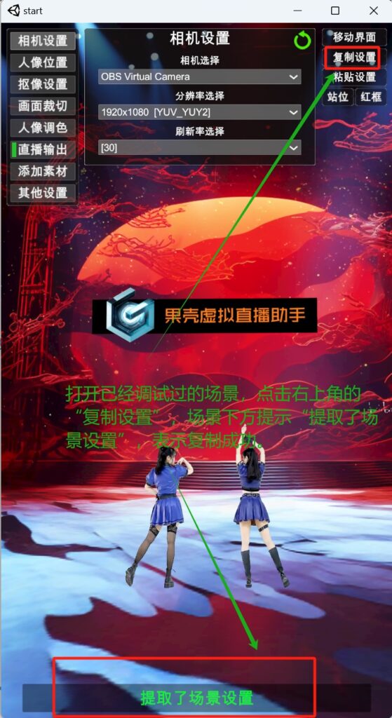 打開(kāi)場(chǎng)景的(de)菜單,點擊“直播輸出”,打開(kāi)虛拟攝像機(jī)(分(fēn)辨率默認設置就(jiù)好(hǎo)),然後打開(kāi)直播伴侶,添加新的(de)攝像頭,選擇“果殼虛拟直播攝像頭”,分(fēn)辨率設置 與 果殼直播輸∞出的(de)分(fēn)辨率必須保持一(yī)緻(1080*1920)。其它平台的(de)直播與之類似,都(dōu)是(shì)添加果殼虛拟攝像頭,分(fēn)辨率設置為(wèi)1080£215;1920。