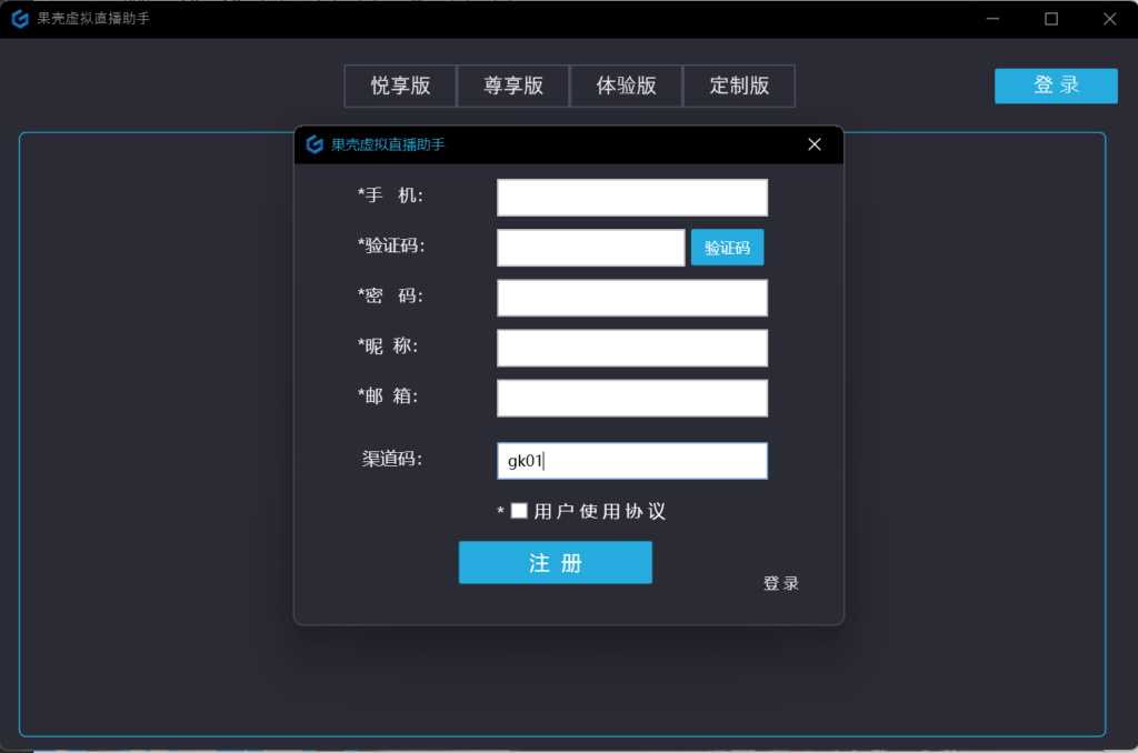 2)運行(xíng)“果殼虛拟直播助手”,選擇“點擊注冊”,進入注冊頁面,填入相(xiàng)關個(gè)人(rén)信息,完成注冊,然後通(tōλng)過剛才注冊的(de)賬号和(hé)密碼進行(xíng)登錄。