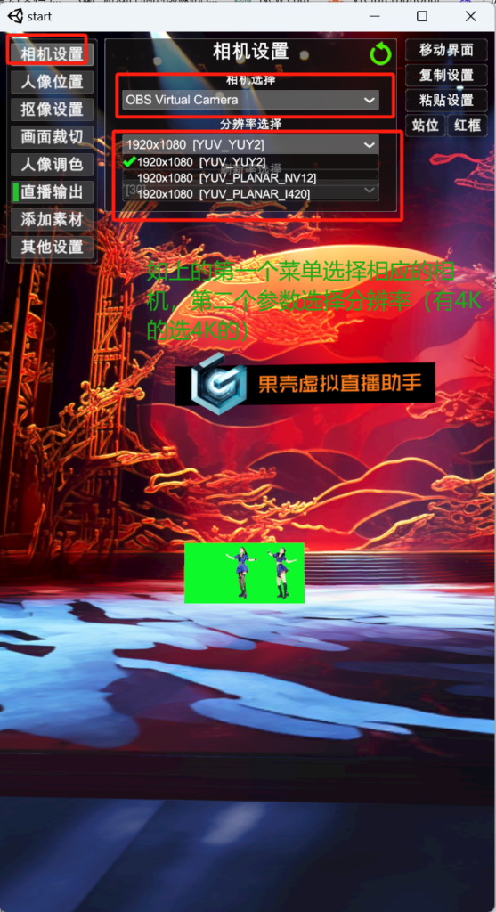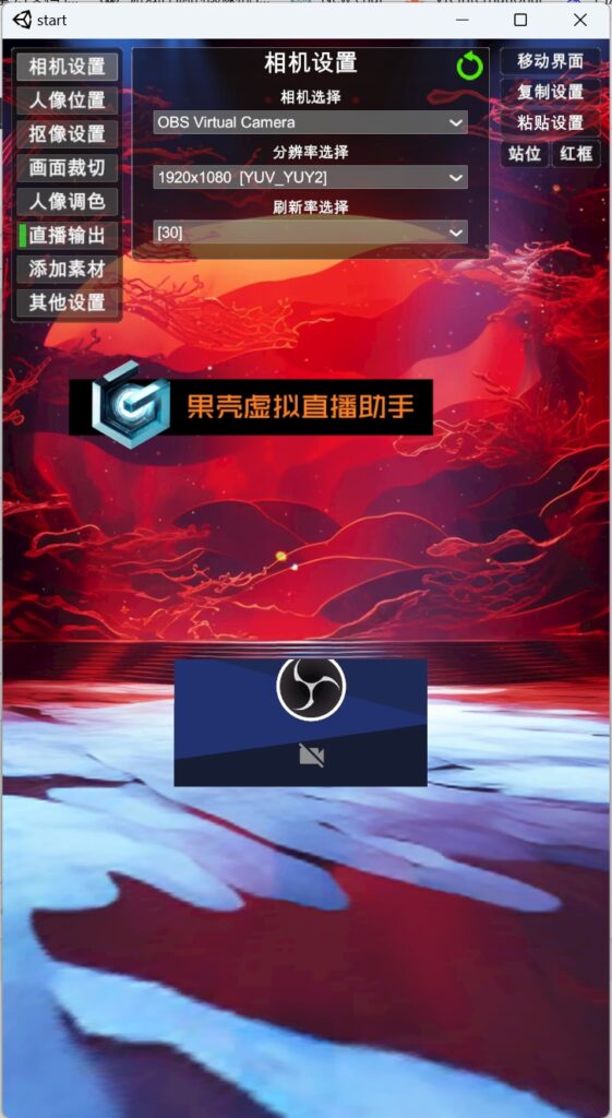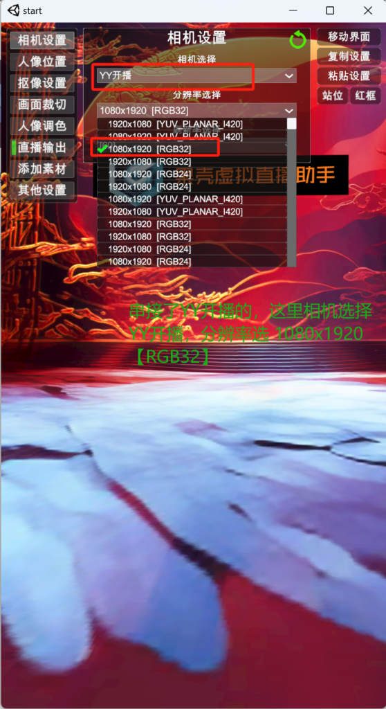 2)相(xiàng)機(jī)選擇:點下(xià)左邊菜單第一(yī)項“相(xiàng)機(jī)設置”,選擇對(duì)應的(de)相(xiàng)機(jī)(下(x&ià)圖用(yòng)了(le)obs虛拟相(xiàng)機(jī),僅是(shì)參考,選實際的(de)物(wù)理(lǐ)相(xiàng)機(jī),串接不(bù)需裝obs),分(¶fēn)辨率往高(gāo)的(de)選(如(rú)串接了(le)YY開(kāi)播的(de),則在此處選擇“YY攝像頭”,分(fēn)辨率£ 1080*1920 RGB32)